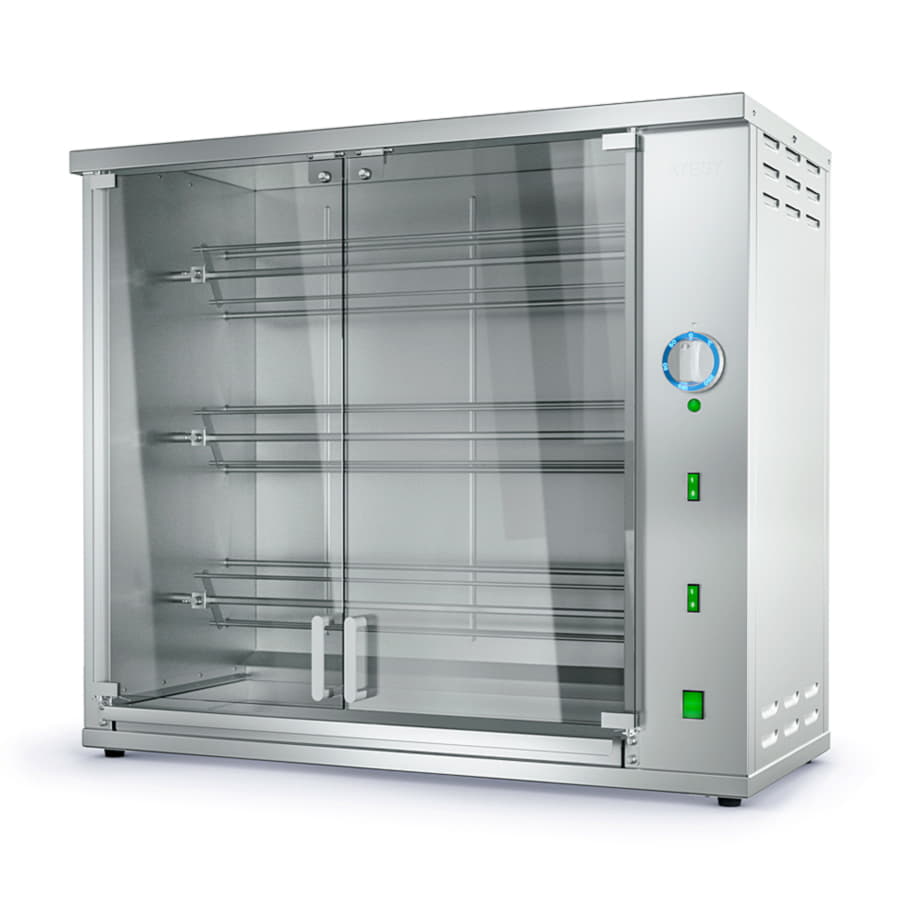 Постоянная скорость вращения шампура и оптимальное расстояние от тушки до ТЭНов обеспечивают равномерную прожарку кур и высокую производительность гриля. Специальный узел вращения и поддержки шампура обеспечивает быструю установку и выемку шампура из гриля. Шампур имеет три спицы и оснащен торцевыми фиксаторами кур, исключающими проворачивание кур во время приготовления. Стеклянные дверцы имеют магнитный фиксатор закрытого положения. В положении открытых дверей шампуры с курами легко вынимаются из гриля. Корпус гриля изготовлен из пищевой нержавеющей стали AISI430.