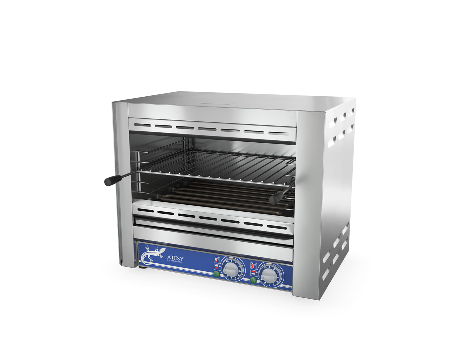 Гриль Саламандра представляет собой шкаф с открытой передней частью, выполненный из нержавеющей стали. Внутри шкафа расположены направляющие для решетки на 4 уровня. Нагрев продукта, располо-женного на решетке, происходит посредством 2-х ТЭНов, которые установлены вверху и внизу гриля. Плавная регулировка температуры осуществляется терморегуляторами. В нижней части гриля расположен поддон для сбора остатков пищи.
