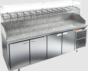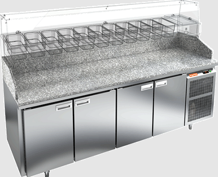 Объем устройства достигает 570 литров, а холодильный агрегат расположен справа, что оптимизирует использование пространства. Столешница выполнена из прочного гранита, а корпус изготовлен из нержавеющей стали, что гарантирует долговечность и легкость в уходе. Устройство работает от сети с напряжением 220 В и мощностью 480 Вт.