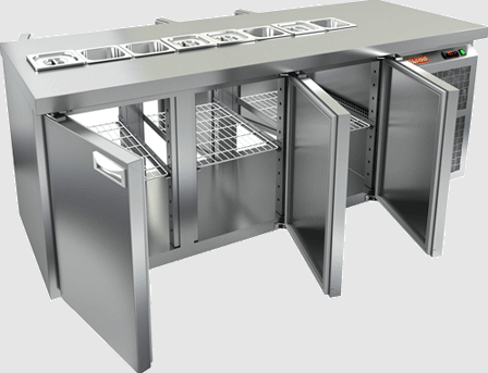 Объем устройства составляет 435 литров, что делает его вместительным для хранения различных ингредиентов. Холодильный агрегат расположен справа, а конструкция соответствует гастронормам, что упрощает организацию рабочего пространства. Стол выполнен из нержавеющей стали, что гарантирует долговечность и легкость в уходе.