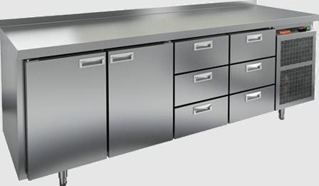 Холодильный агрегат расположен справа, а конструкция стола выполнена из нержавеющей стали, что гарантирует долговечность и легкость в уходе. Столешница также изготовлена из нержавеющей стали и имеет толщину 50 мм, что обеспечивает надежность и устойчивость к механическим повреждениям.