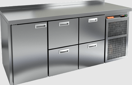 Холодильный агрегат расположен справа, что позволяет оптимально использовать пространство. Стол соответствует гастрономическим стандартам и оснащен бортиком для предотвращения случайного падения продуктов. Устройство работает от сети с напряжением 220 В и мощностью 600 Вт, что делает его экономичным в использовании.