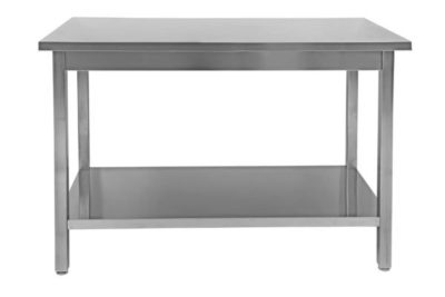 Стол имеет прямоугольную столешницу без борта, выполненную из пищевой нержавеющей стали AISI 430, которая дополнительно укреплена листом древесно-стружечной плиты с внутренней стороны. Это обеспечивает высокую прочность и предотвращает прогиб столешницы. Все кромки столешницы обработаны, что исключает риск травмирования персонала во время сборки, эксплуатации и санитарной обработки. Отсутствие борта позволяет устанавливать стол в любом месте и работать с любой стороны.