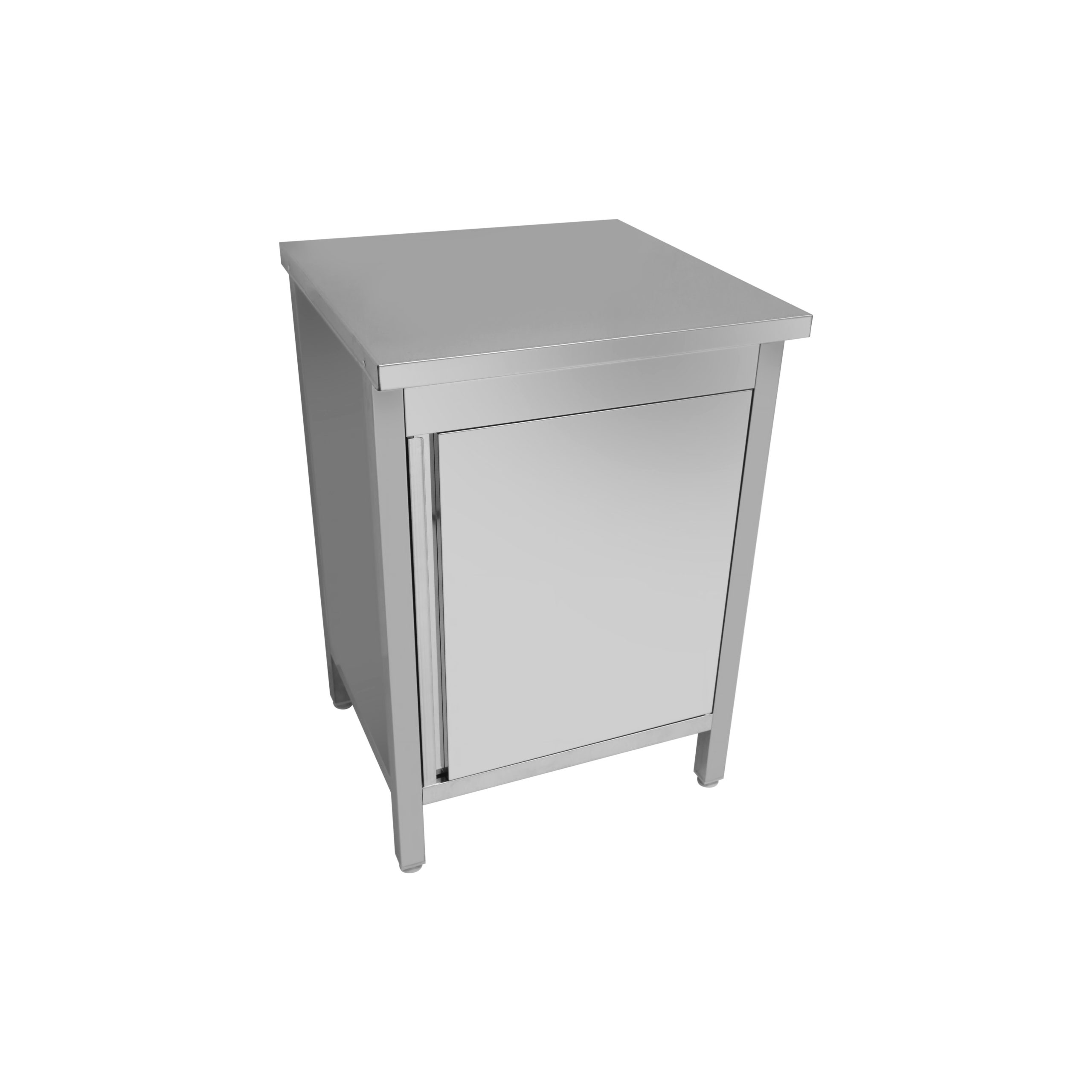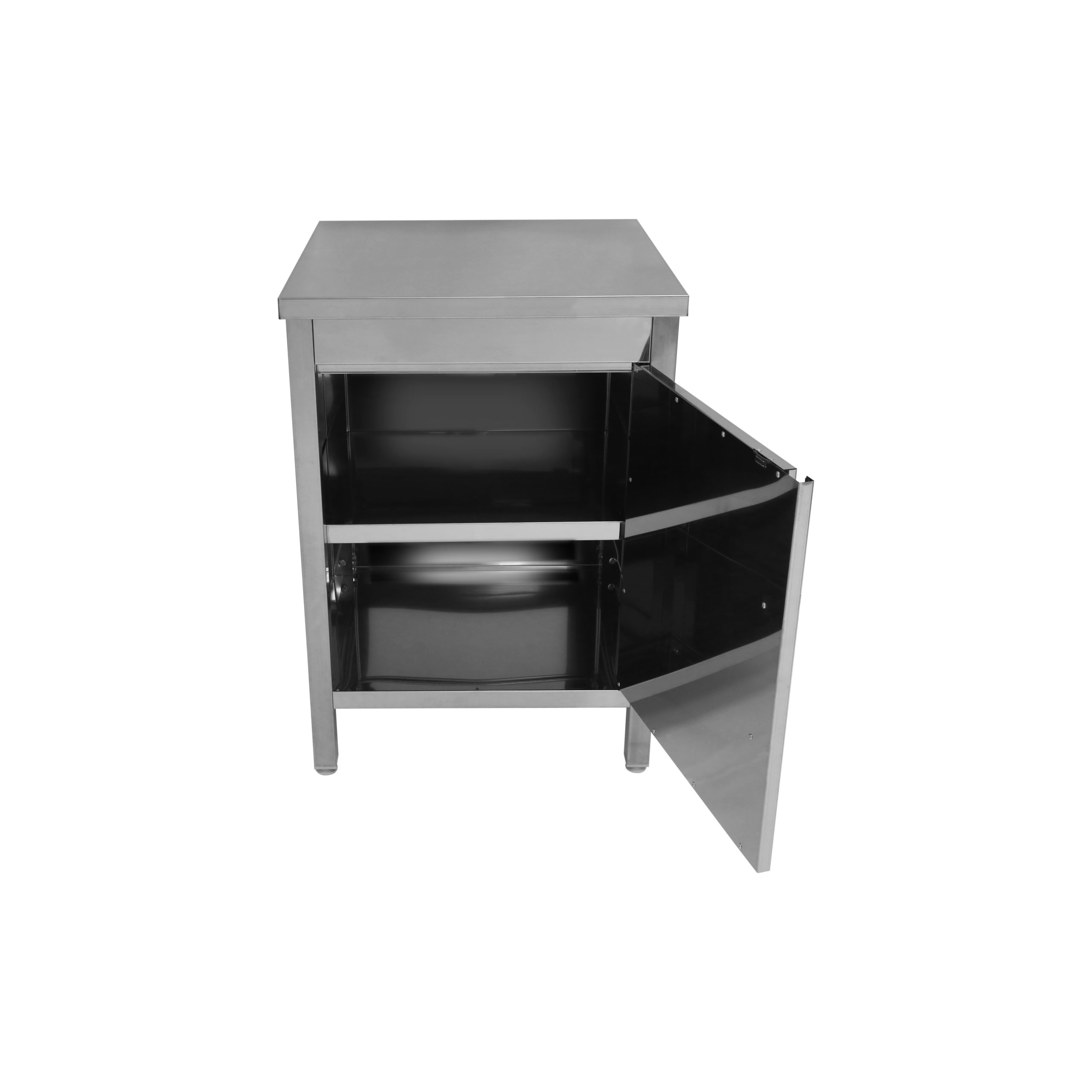 Стол с распашными дверцами имеет прямоугольную столешницу, выполненную из пищевой нержавеющей стали AISI 430, которая дополнительно укреплена древесно-стружечной плитой с внутренней стороны. Это обеспечивает высокую прочность и предотвращает прогиб столешницы. Каркас и полка изготовлены из крашеной стали, а все кромки столешницы обработаны, что исключает риск травм при использовании и санитарной обработке. Отсутствие борта позволяет удобно размещать стол в любом уголке помещения и работать с любой стороны.