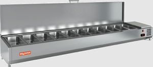 С размерами 2280 мм в длину, 385 мм в глубину и 279 мм в высоту, она прекрасно впишется в любое пространство. Внутренний объем составляет 97 литров, что позволяет разместить до 11 контейнеров формата GN1/3. Устройство работает на напряжении 220 В и потребляет всего 150 Вт мощности, что делает его экономичным в использовании.